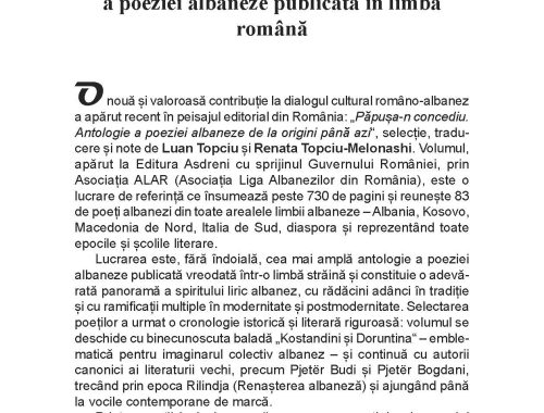 Liviu Lungu ‑ „Păpușa‑n concediu“ ‑ o amplă antologie a poeziei albaneze. Traducere și note de Ioan Topciu și Renata Topciu‑Melonashi