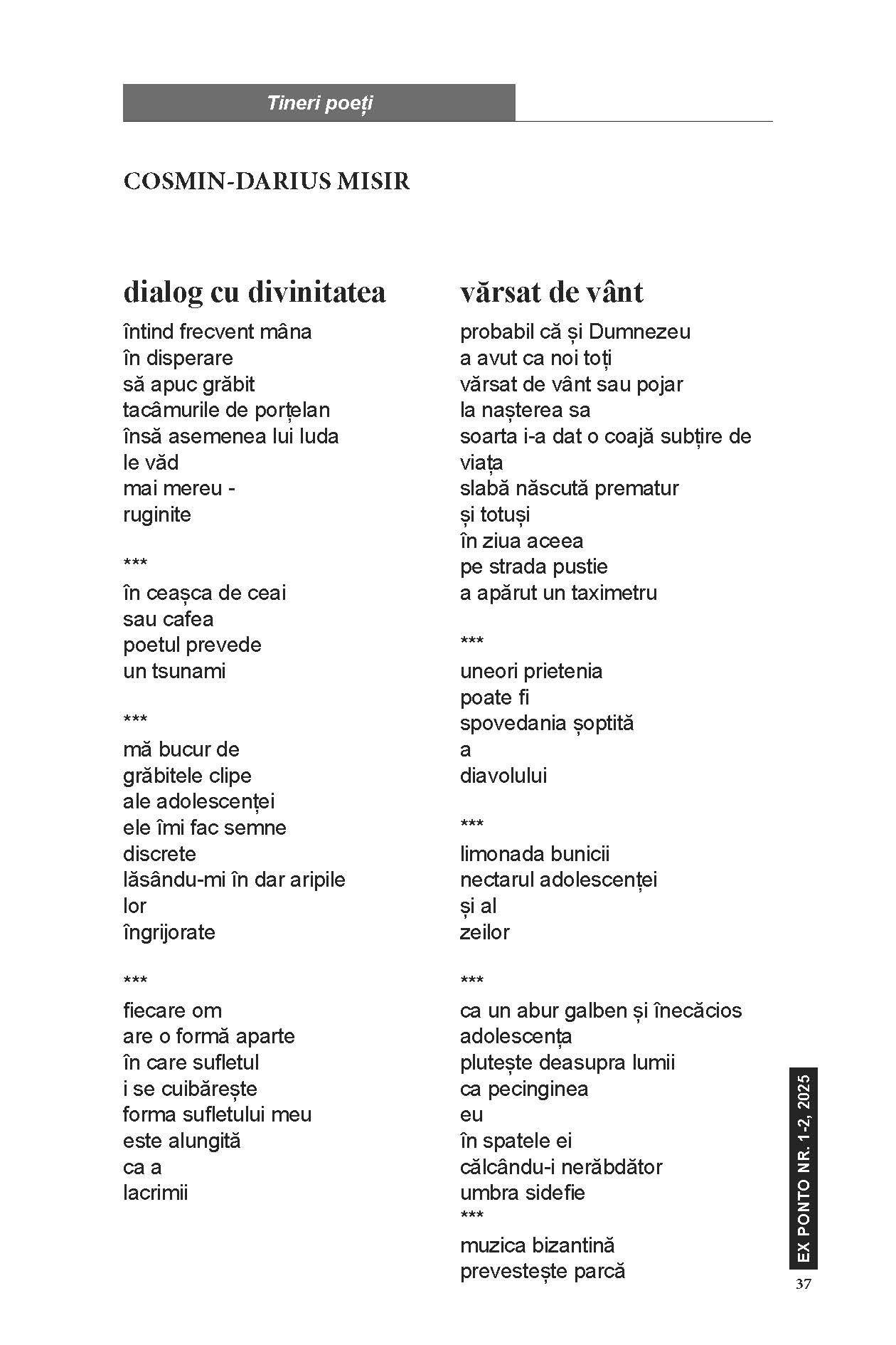 #84-85 iulie 2025, TEXT, Tineri poeți Cosmin‑Darius Misir Anterior Sophia Nicole Hagi Mai nou Liviu Vișan S-ar putea să-ți placă și Andreea Valentina Miroiu. Eros și thanathos sub lună mușcată de câine 23 februarie 2026 Elena Netcu ‑ Ipostaze lirice în poezia lui Ioan Gheorghiță 22 februarie 2026 Ana Dobre ‑ Poezia ‑ spațiul regăsirii de sine (Mihaela Meravei) 22 februarie 2026 Lasă un răspuns Anulează răspunsulAdresa ta de email nu va fi publicată. Câmpurile obligatorii sunt marcate cu *Nume Email Site web Salvează-mi numele, emailul și site-ul web în acest navigator pentru data viitoare când o să comentez. Comentariu Δ