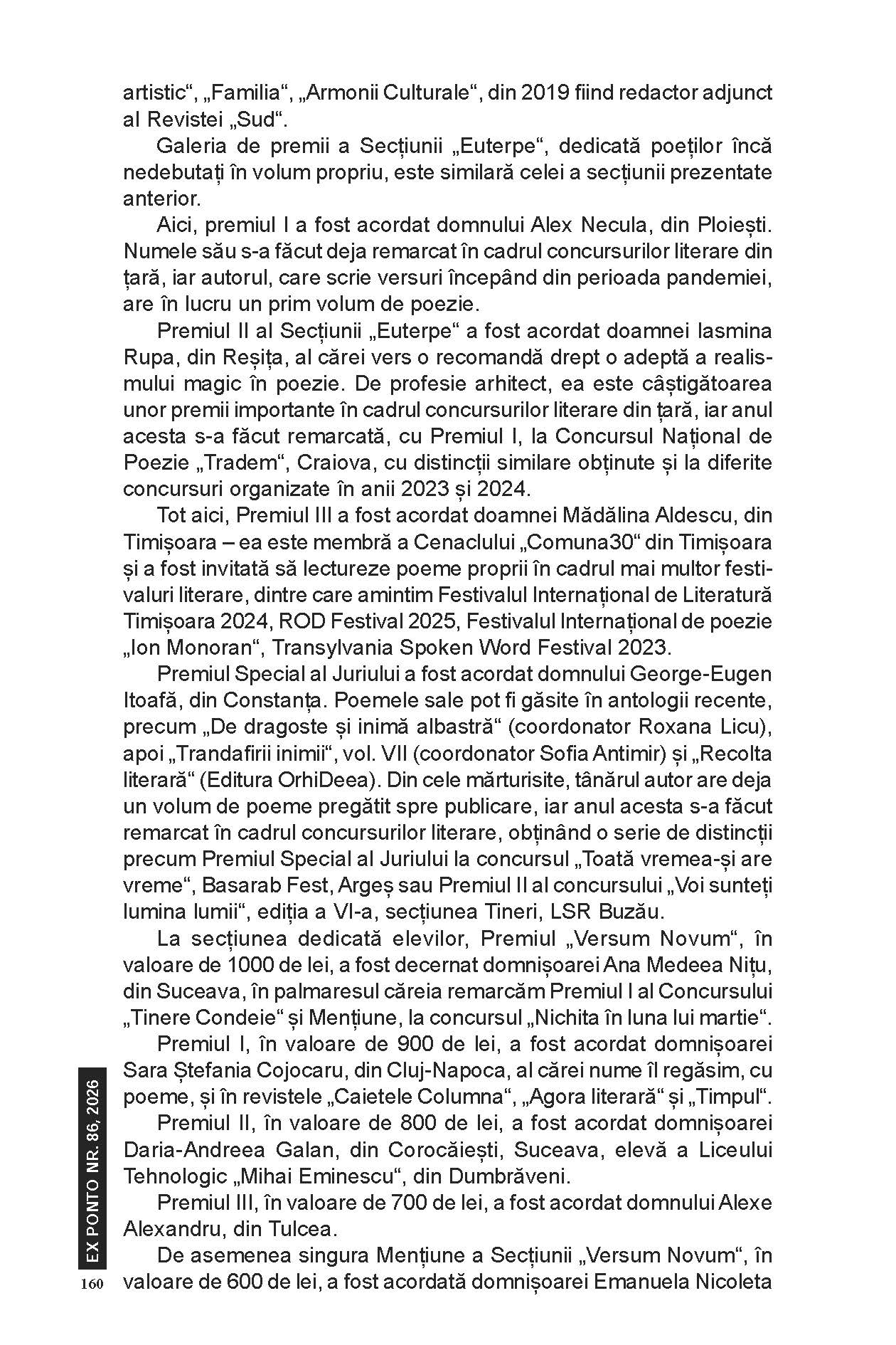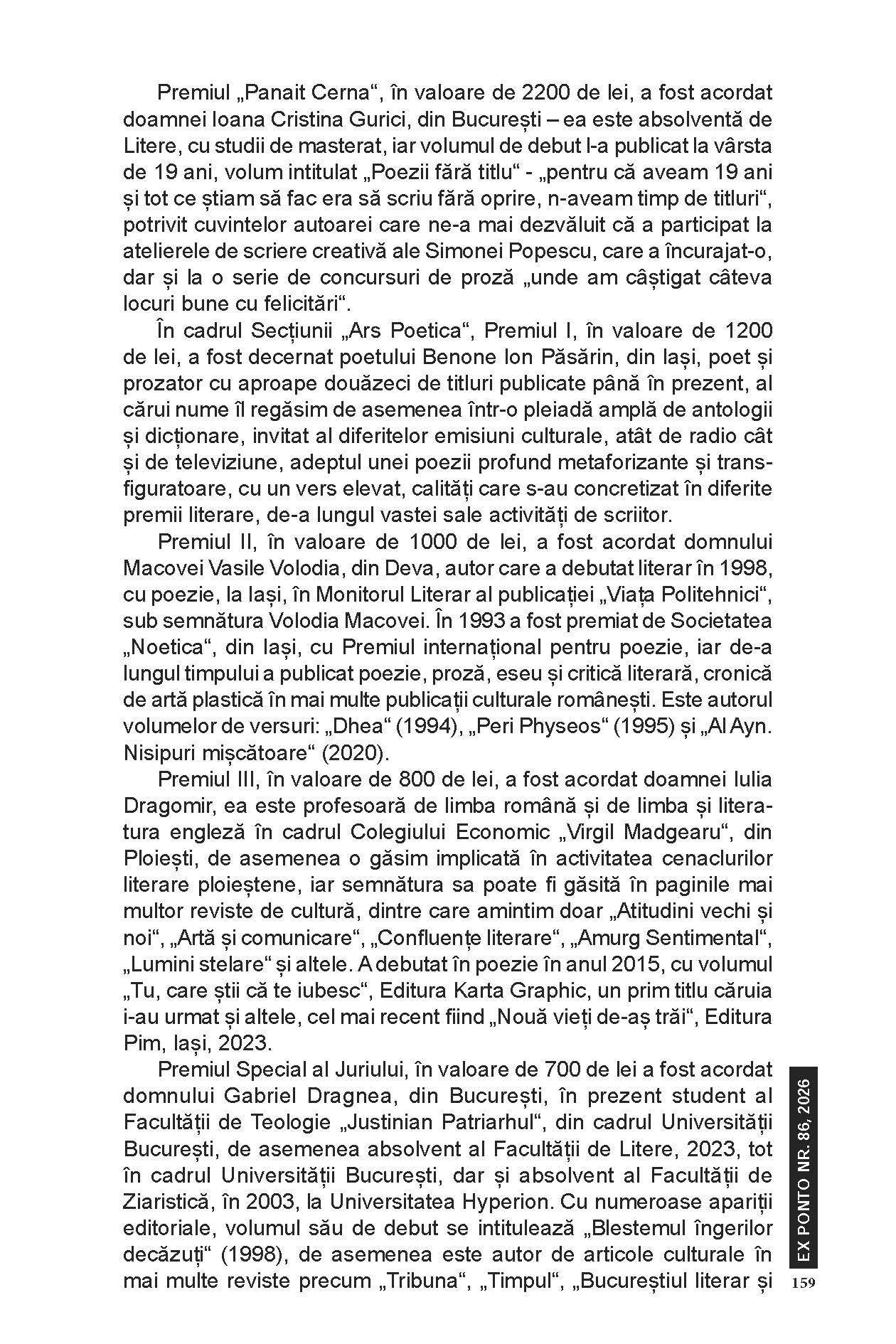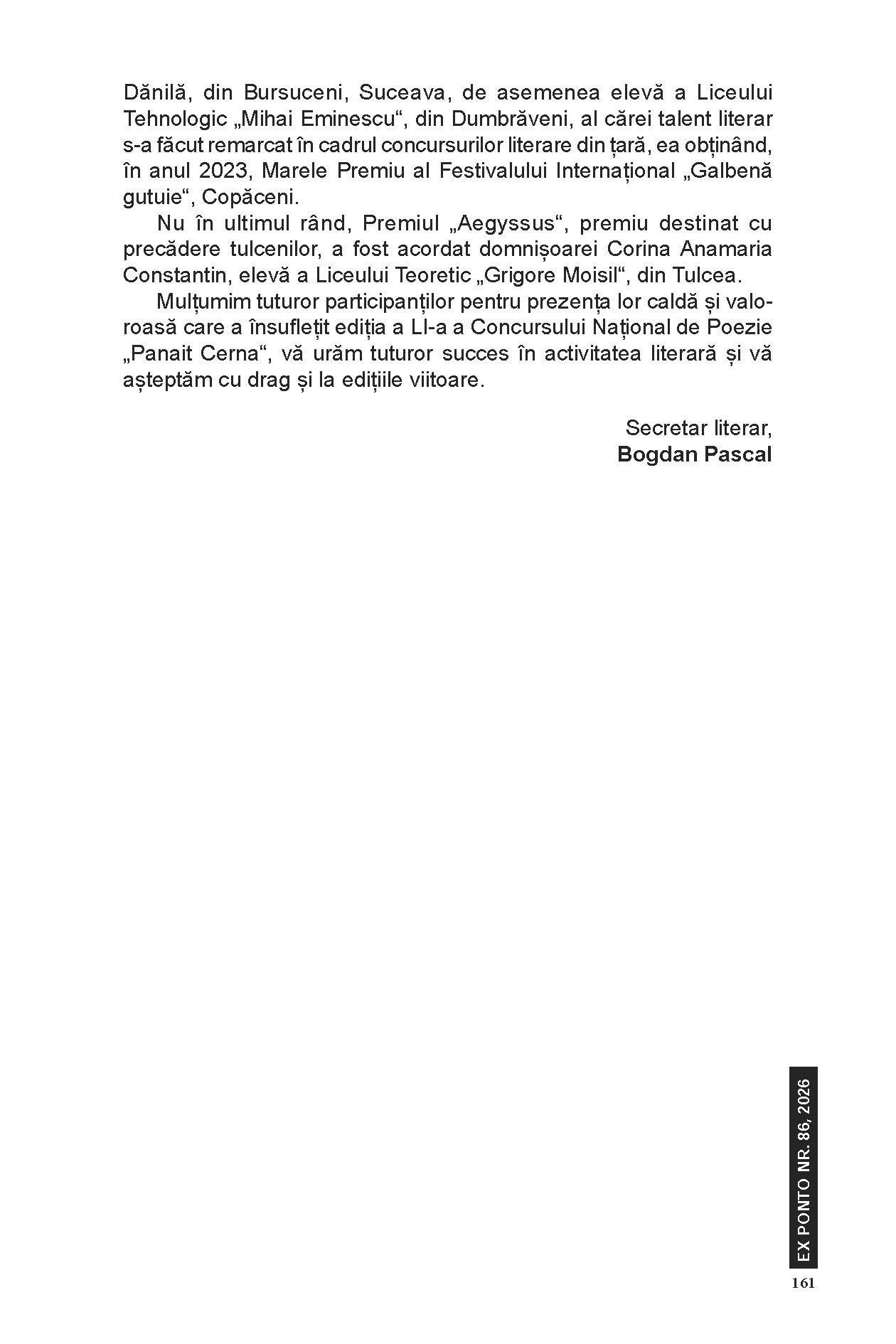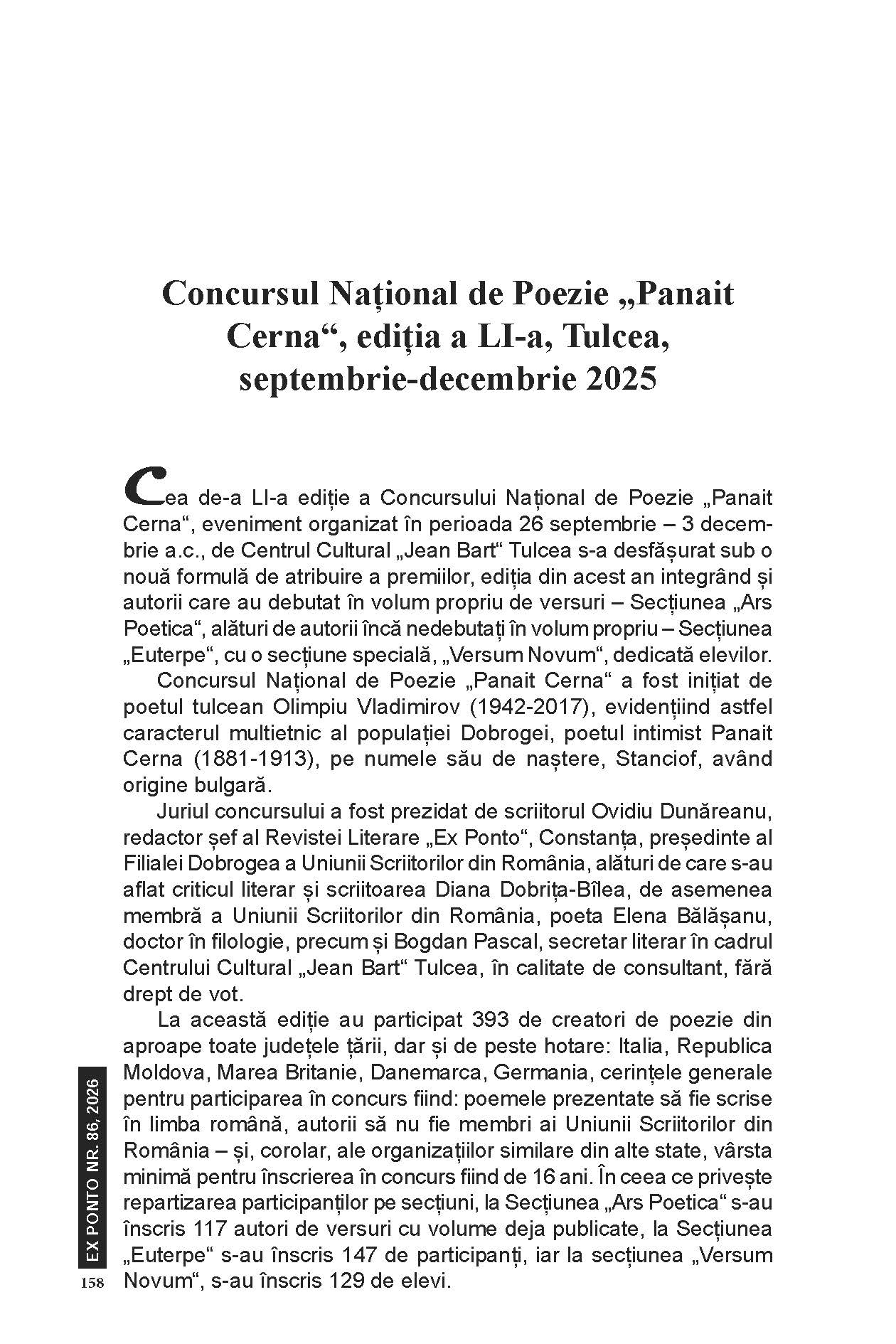 #86 februarie 2026, METATEXT, Tulcea literar-culturală Concursul Național de Poezie „Panait Cerna“, ediția a LI‑a, Tulcea, septembrie‑decembrie 2025 – Bogdan Pascal Anterior Ioana Cristina Gurici (Câștigătoarea Premiului „Panait Cerna“). Poezii Mai nou Nic Popescu (Câștigătorul Premiului „Valentin Șerbu“ ‑ Nici moartea nu mai e ce-a fost. Fragment) S-ar putea să-ți placă și Premiile Filialei Dobrogea a Uniunii Scriitorilor din România și ale Revistei Ex Ponto pe anul 2024 2 martie 2026 Cristina – Monica Neagoe ‑ Crâmpeie de (i)realitate, sub semnul unei vieți captivante. Dialog cu NICOLAE BREBAN 2 martie 2026 Titi Damian ‑ D.R. Popescu, Vânătoare regală (partea a II‑a) 2 martie 2026 Lasă un răspuns Anulează răspunsulAdresa ta de email nu va fi publicată. Câmpurile obligatorii sunt marcate cu *Nume Email Site web Salvează-mi numele, emailul și site-ul web în acest navigator pentru data viitoare când o să comentez. Comentariu Δ