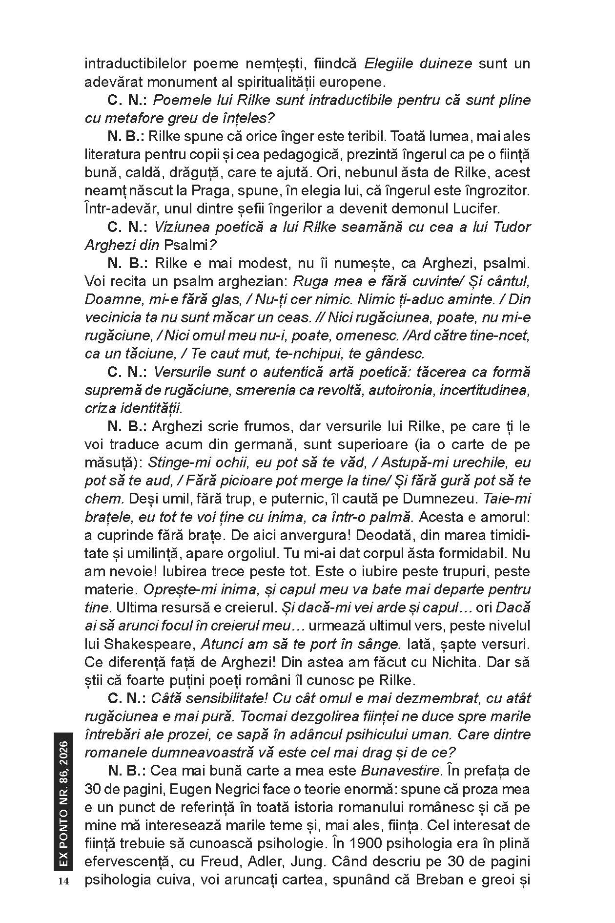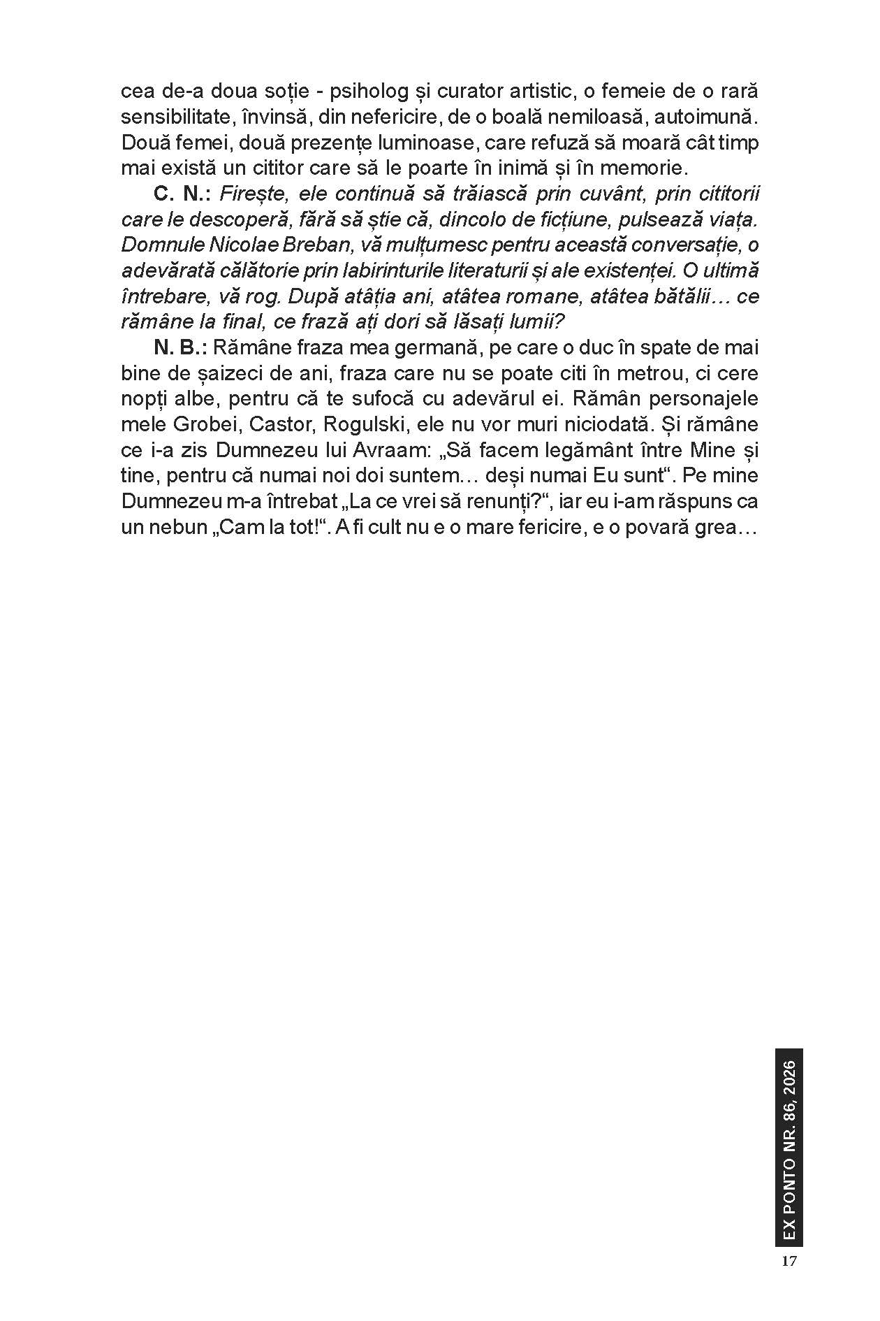#86 februarie 2026, Interviu Ex Ponto, TEXT Cristina – Monica Neagoe ‑ Crâmpeie de (i)realitate, sub semnul unei vieți captivante. Dialog cu NICOLAE BREBAN Anterior Titi Damian ‑ D.R. Popescu, Vânătoare regală (partea a II‑a) Mai nou Premiile Filialei Dobrogea a Uniunii Scriitorilor din România și ale Revistei Ex Ponto pe anul 2024 S-ar putea să-ți placă și Tudor Cicu „Caligrafia unei duminici“ (Ottilia Ardeleanu) 27 februarie 2026 Gabriela Vlad. Hyaku haiku ‑ sau o sută de imagini ale vieții (Radu Șerban) 26 februarie 2026 Titi Damian ‑ D.R. Popescu, Vânătoare regală (partea a II‑a) 2 martie 2026 Lasă un răspuns Anulează răspunsulAdresa ta de email nu va fi publicată. Câmpurile obligatorii sunt marcate cu *Nume Email Site web Salvează-mi numele, emailul și site-ul web în acest navigator pentru data viitoare când o să comentez. Comentariu Δ